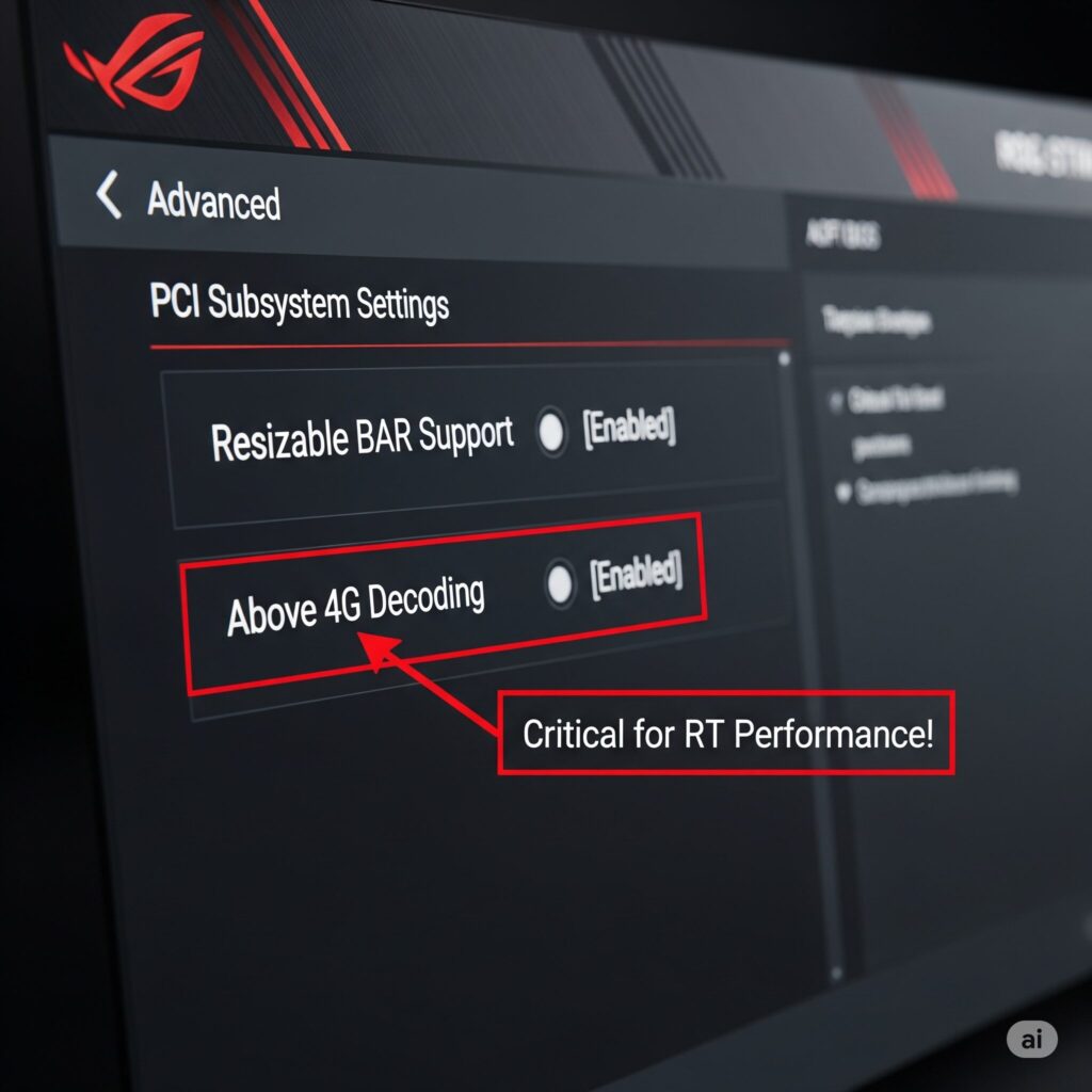 - This feature allows your CPU to access the entire GPU frame buffer (VRAM) at once, rather than in small chunks, reducing overhead and boosting performance, especially in CPU-limited scenarios common with RT. Enable it in your BIOS! (Consult your motherboard manual). Also ensure it’s enabled in your GPU control panel (it usually is by default if BIOS is set).