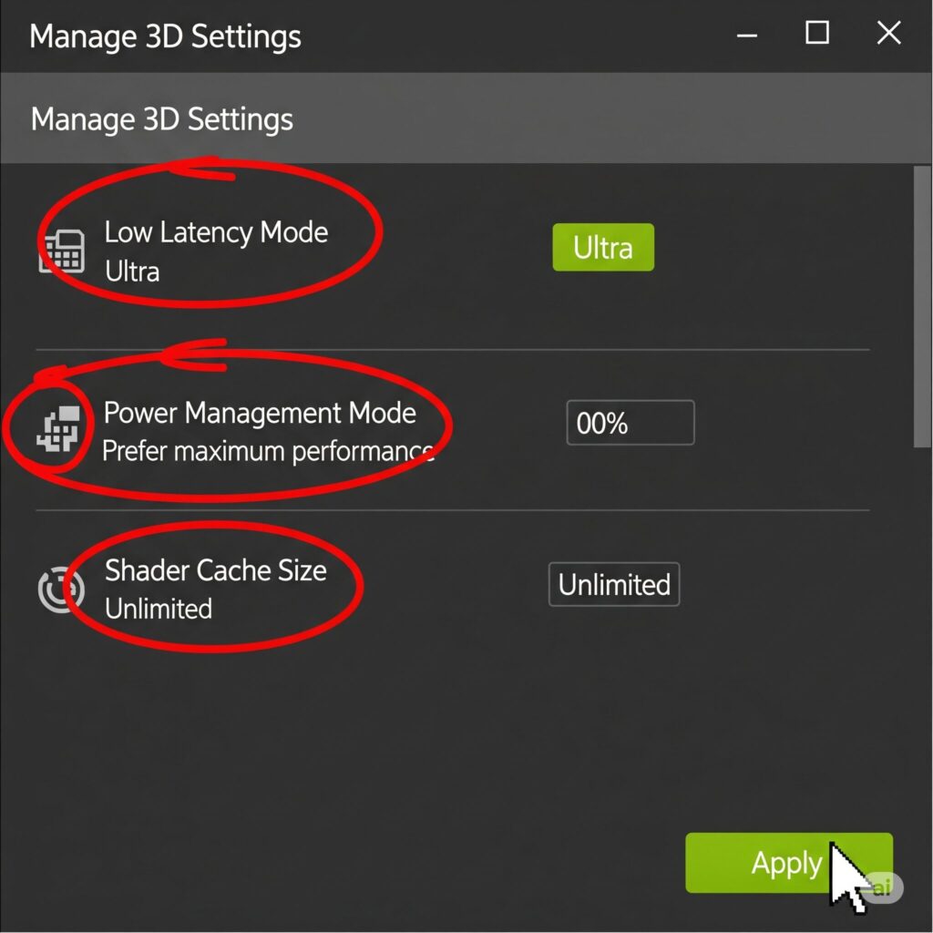 | Increase Shader Cache | MED (Stutters) | NVIDIA: “Unlimited”. AMD: “AMD Optimized/Enabled”. Reduces shader comp stutter. |